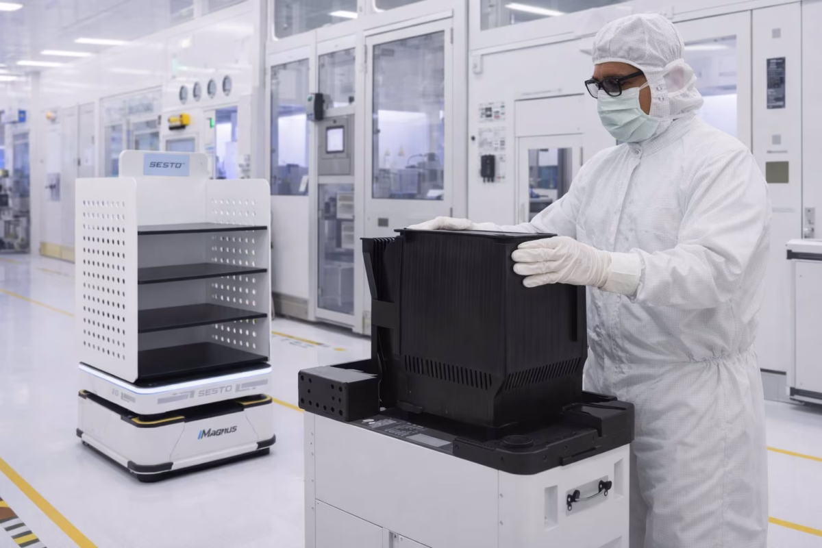 SESTO’s AMRs equipped with shelves automate the transportation of heavy tote boxes across long distances—up to 40 km per day—within a large semiconductor manufacturing facility in China. By replacing manual material movement with autonomous delivery, the system enhances productivity, operator safety, and traceability across clean production environments.